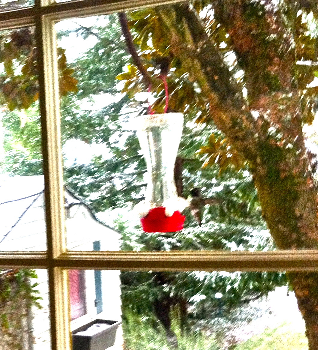Before reading the paper, I thawed out the humming bird feeder. If you look closely to the right of the feeder, you can see that a hungry hummie promptly showed up for breakfast.