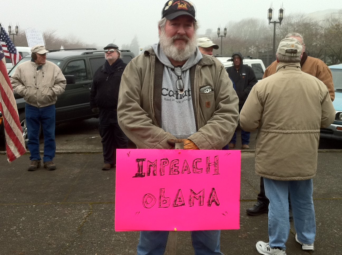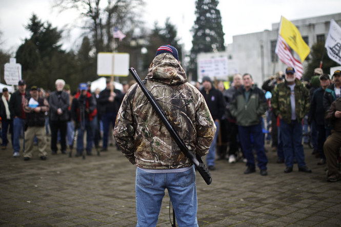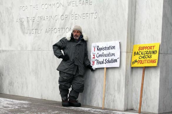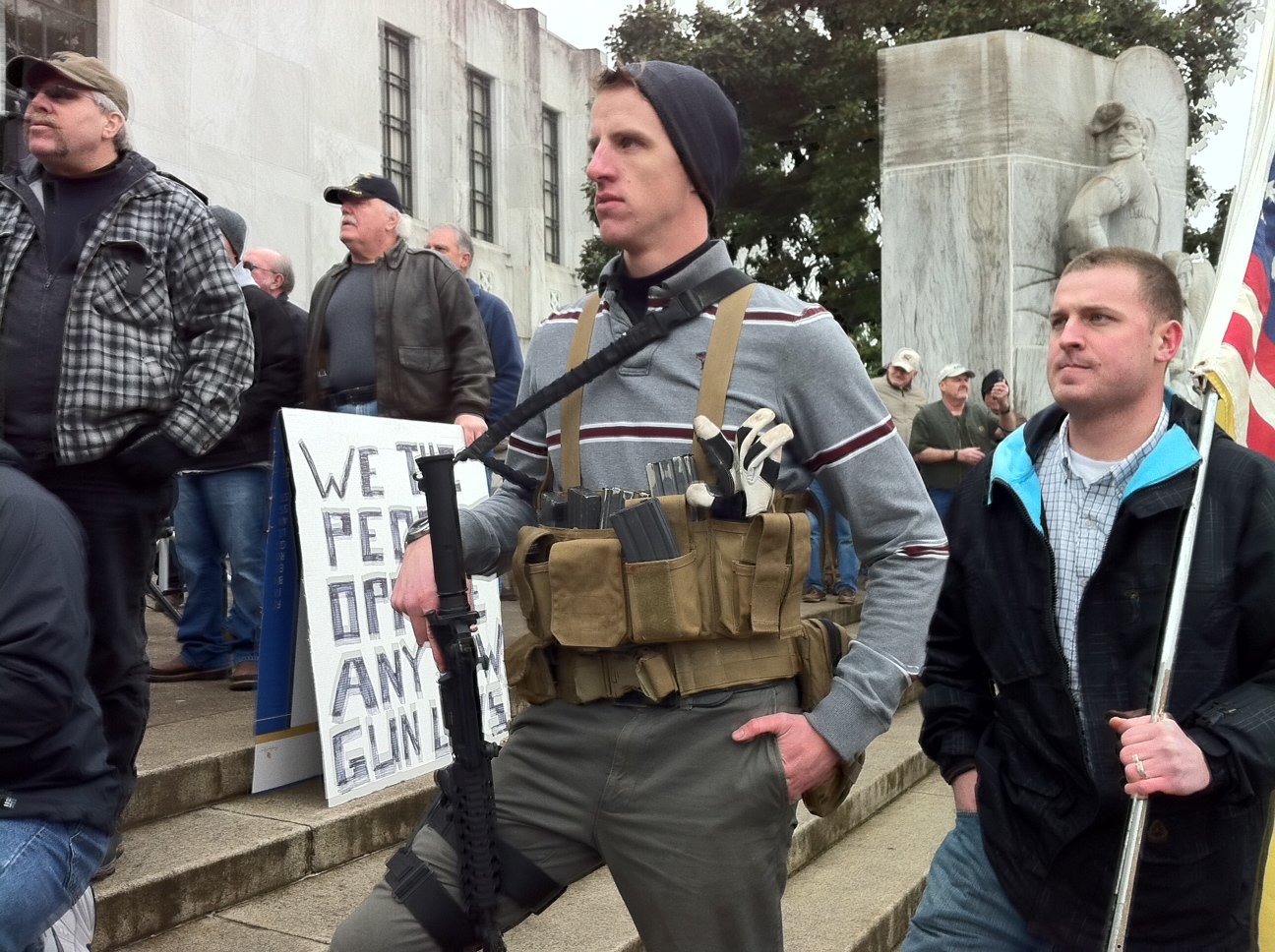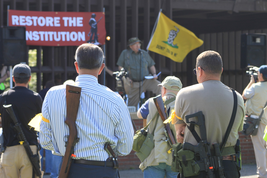 Recently, there’s been a bill before our legislature designed to keep firearms out of the hands of criminals and the criminally insane, so a good number of people have been over there in camo, carrying big guns and signs reading, “Don’t let Obama take your guns away.”